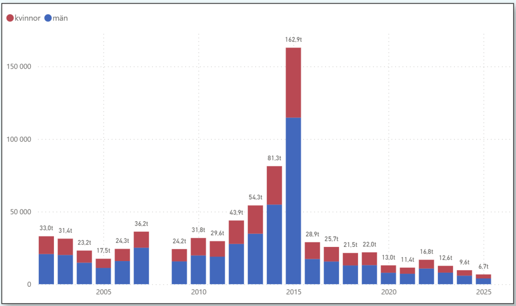 Bild 1. Utfärdade uppehållstillstånd 2018 – 2025.