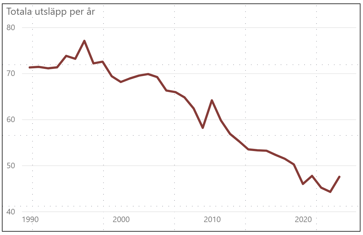 De totala utsläppen har minskat sedan 1990 fast den uppmärksammade ökningen mellan 2023-24 dominerar i debatten.