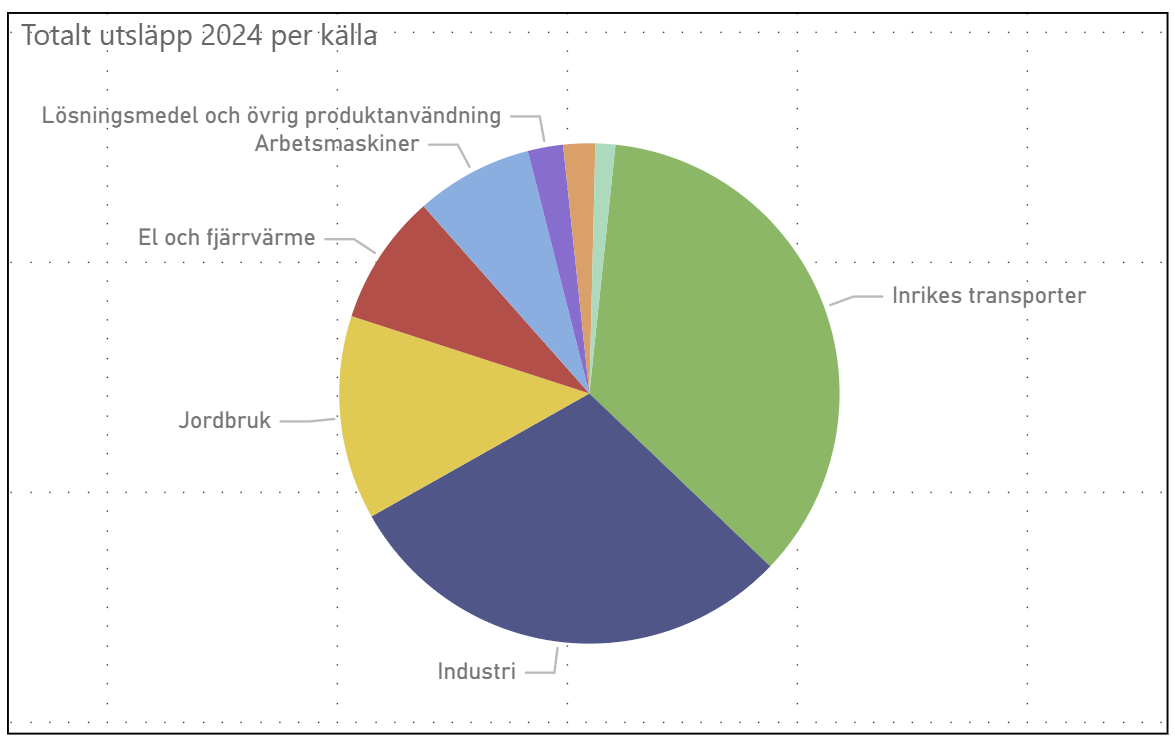 Inrikes transporter är den största utsläppskällan 2024 med ca 35% av totalen, följt av industri och jordbruk.
