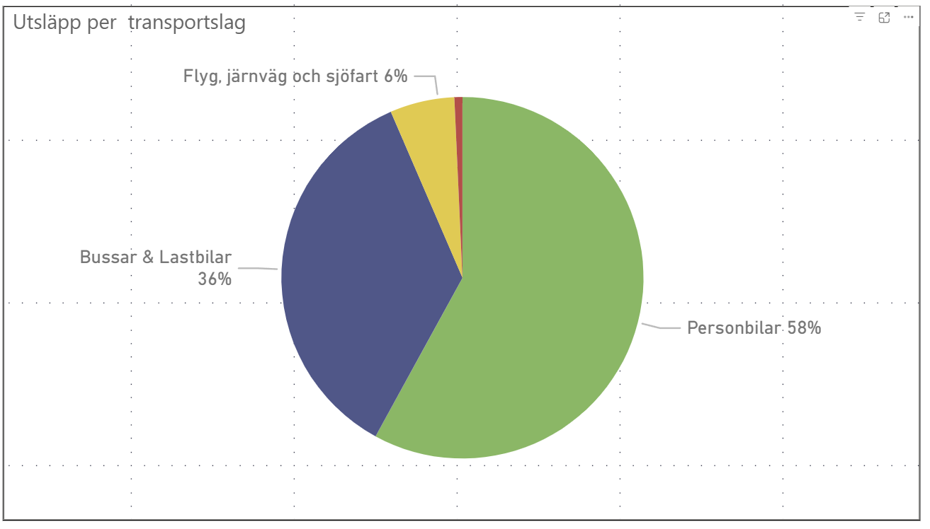 Personbilar och yrkestrafik för ca 94% av områdets utsläpp. Inrikesflyget, som jag grupperat in tillsammans med järnväg och sjöfart står för ca 0,3% av de totala utsläppen.