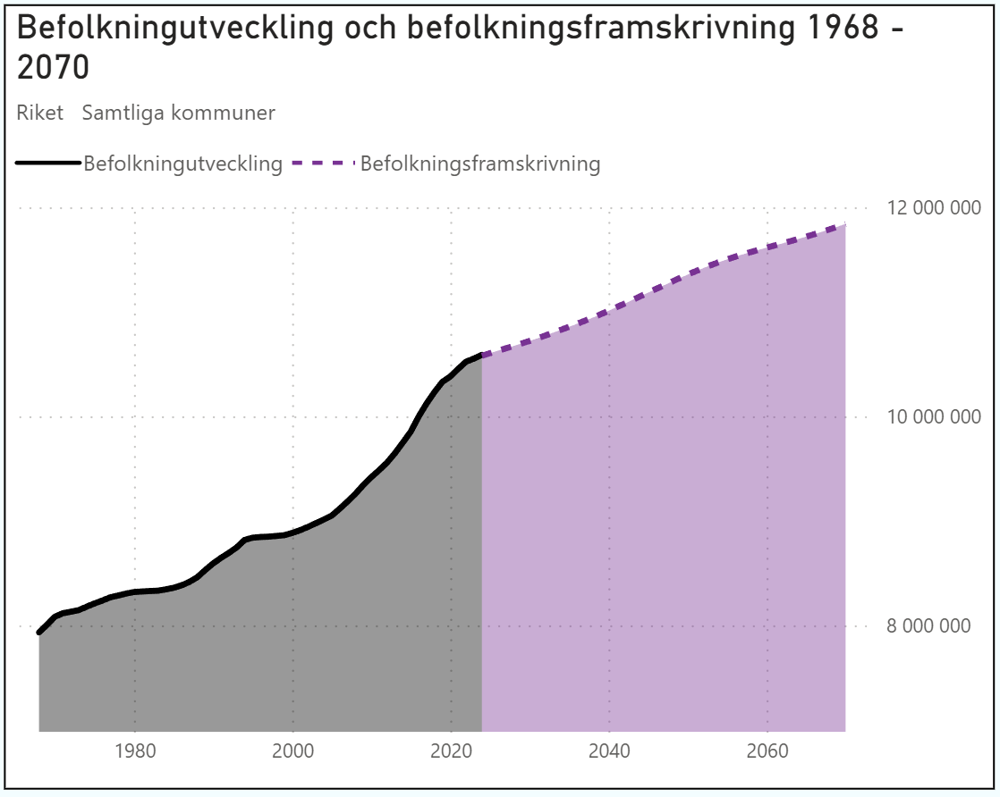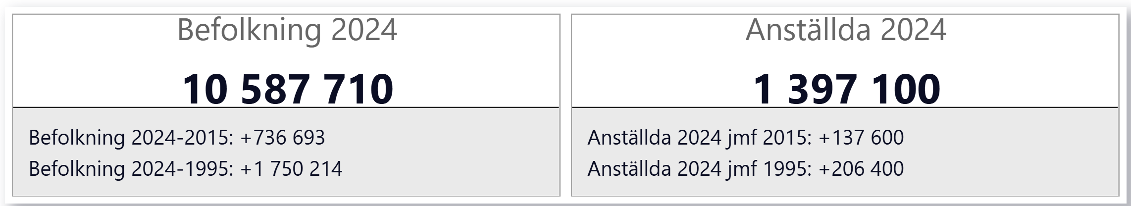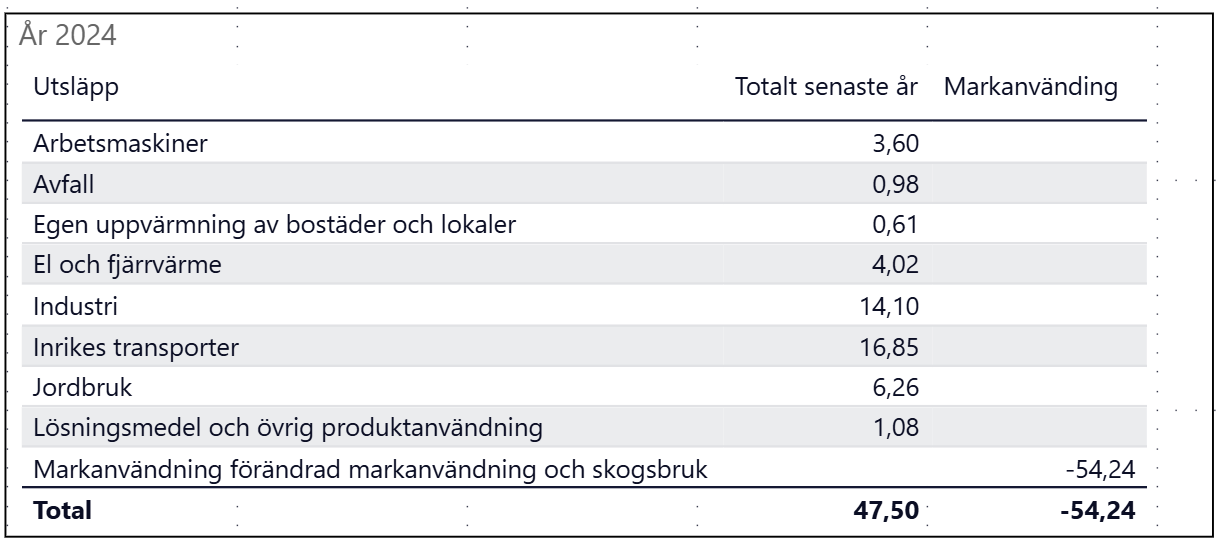 Utsläppen år 2024 uppgår till 47,5 miljoner ton, vilket är 67% av vad som släpptes ut 1990. Sveriges befolkning har samtidigt ökat med 2 miljoner personer varför utsläpp per person (4,49 ton/år) uppgår till 54% av 1990s värde.