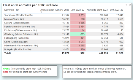 Exempel: Kommuner med flest anmälda brott per 100 000 invånare.