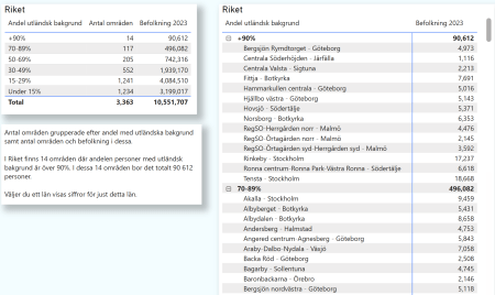 SCB har utförlig statistik ner på områdesnivå för befolkning, boende, utbildningsnivå och härkomst. Denna rapport (förfinad med Power BI så klart) visar folkmängd samt svensk och utländsk bakgrund över tidsperioden 2010 – 2023.
