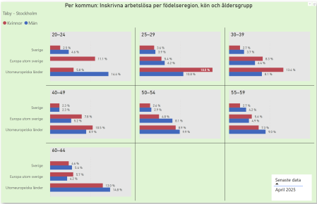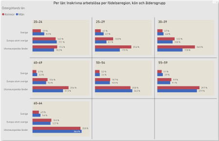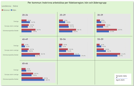 För varje län och kommun kan man se andelen arbetslösa uppdelat på kön, åldersgrupp och bakgrund.