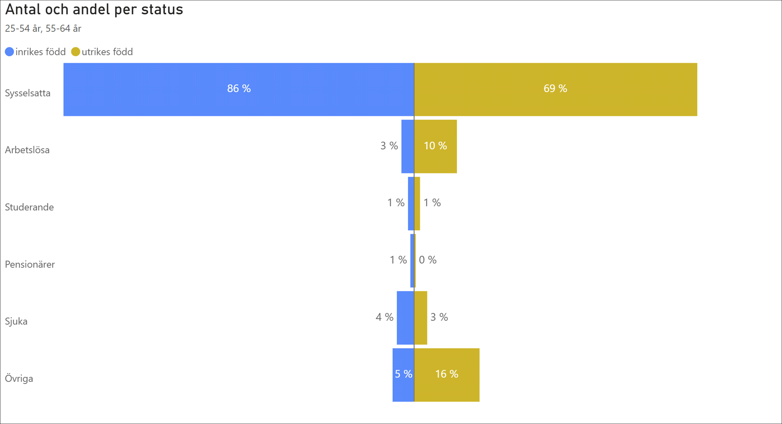 Nedan ser vi den s.k. arbetsmarknadsstatusen för folk mellan 25 och 64 år, uppdelat på födelseregion. För inrikes födda är 86 % sysselsatta medan motsvarande andel för utrikes födda är 69% vid slutet av januari 2025.