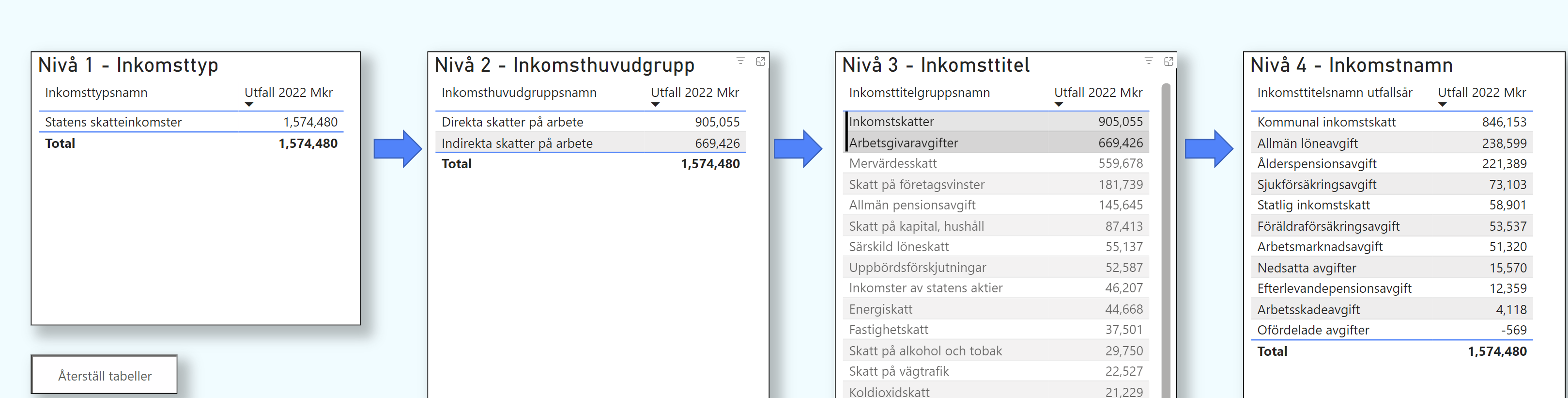Nedan är ett exempel på hur Statens skatteinkomster och Direkta skatter på arbete delas upp i olika poster. Notera hur relativt liten andel den Statliga inkomstskatten står för.