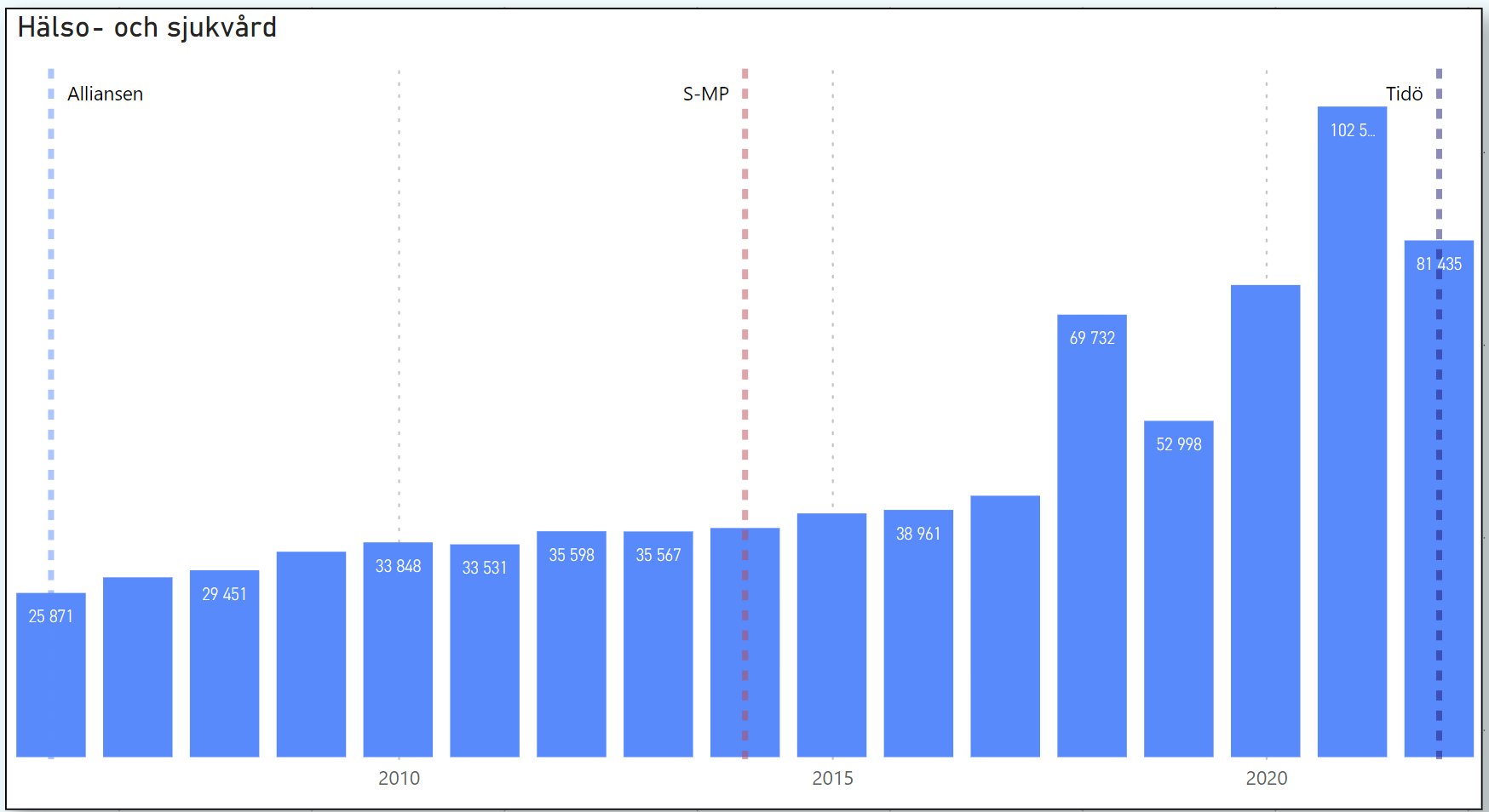 Här är ett diagram som visar utgifter för området Hälso- och sjukvård från 2006 till 2022 (senaste data). Jag har markerat de olika regeringarna och konstaterat att utgifterna ökar oavsett vem som sitter i Rosenbad.