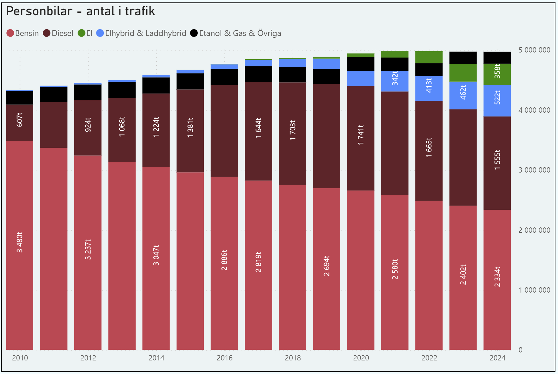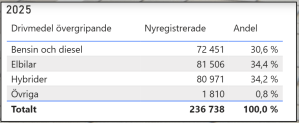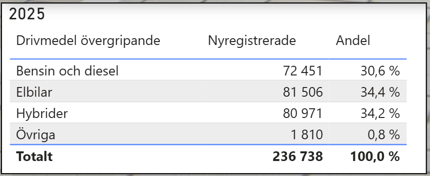 Årsstatistiken för 2025 visar att 69 procent av nyregistrerade personbilar hade någon form av eldrift.