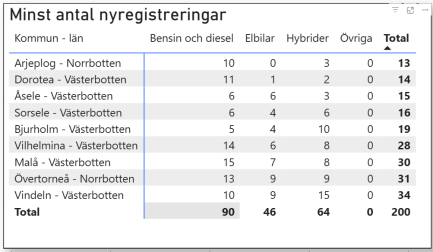 Topplistan sorterad i den andra riktningen, dvs minst antal registrerade, toppas av Arjeplog i en annars Västerbotten-dominerad lista.
