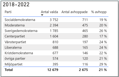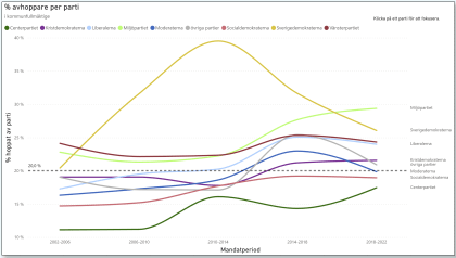 Tittar vi på avhopp per parti ser vi att Sverigedemokraterna hade nästan 40% avhopp under mandatperioden 2010–2014 för att sedan sjunka i nivå med de övriga partierna.