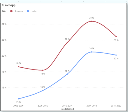 Kvinnor hoppar av i högre grad än män. Som diagrammmet nedan visar så toppade andelen avhopp under förrförra mandatperioden.
