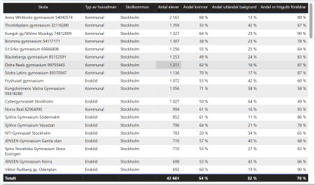 Skolverket har väldigt omfattande statistik ner på skolnivå – antal elever med svensk eller utländsk bakgrund, betyg, föräldrarnas utbildningsnivå och antalet lärare med olika behörigheter.