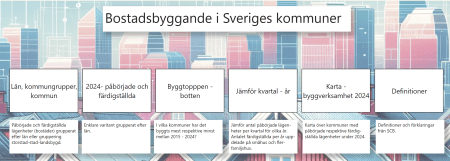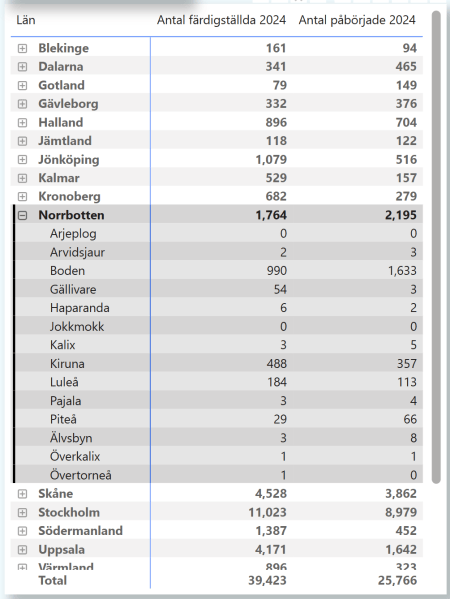 SCB håller koll antalet påbörjade och färdigställda lägenheter (lägenhet = bostad) per kvartal. Power BI hjälper som vanligt till med att klara ut både övergripande trender och att dyka ner i detaljer i riket, län och kommuner.