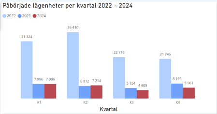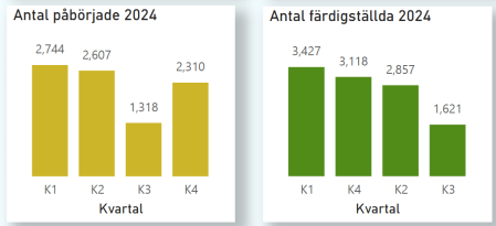 Vi läser att det byggs för lite i landet och det verkar stämma när man tittar på statistiken. Antalet lägenheter som har påbörjats åren 2023 – 2024 är en bråkdel av det antalet som påbörjades under 2022.