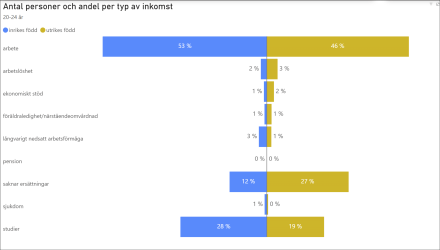 Tittar vi på huvudsaklig inkomstkälla för personer mellan 20–24 år ser vi självklart höga andelar som har studiestöd. Att 12 respektive 27%, beroende på bakgrund, saknar någon form av ersättning bör utredas ytterligare.
