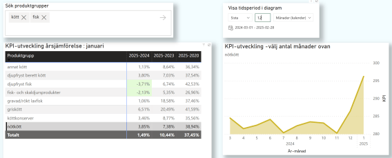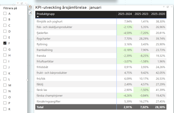 Priser på framför allt livsmedel fluktuerar över säsongen och ett vedertaget sätt att mäta är att jämföra en viss period med föregående år. I rapporten har jag valt att jämföra senaste månad med data för 2025 med samma månad åren 2024, 2023 och 2020. När siffor nya månadssiffror publiceras uppdateras rapporten.