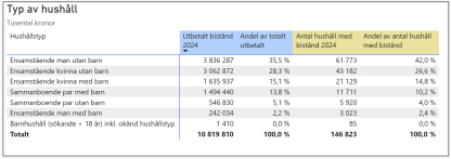I tabellen ovan ser vi att Ensamstående män utan barn är den antalsmässigt största gruppen (42%) och står för 35,5% av det totala stödet i kronor eller dryga 3,8 miljarder kronor (2024).