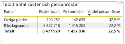 I riksdagsvalet 2022 var 22,5% eller dryga 1.4 miljoner röster personröster, dvs röster på en specifik kandidat