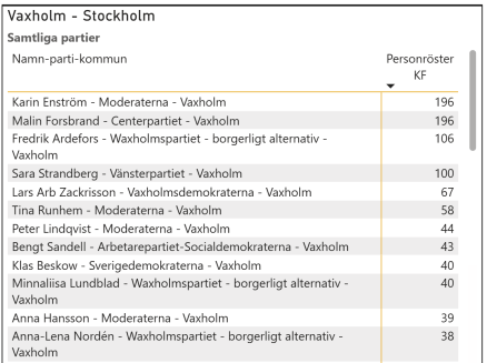Gå vi in på en enskild kommun, i detta fall Vaxholm ser vi att representanter från lokala partier kan hamna högt upp i tabellen.